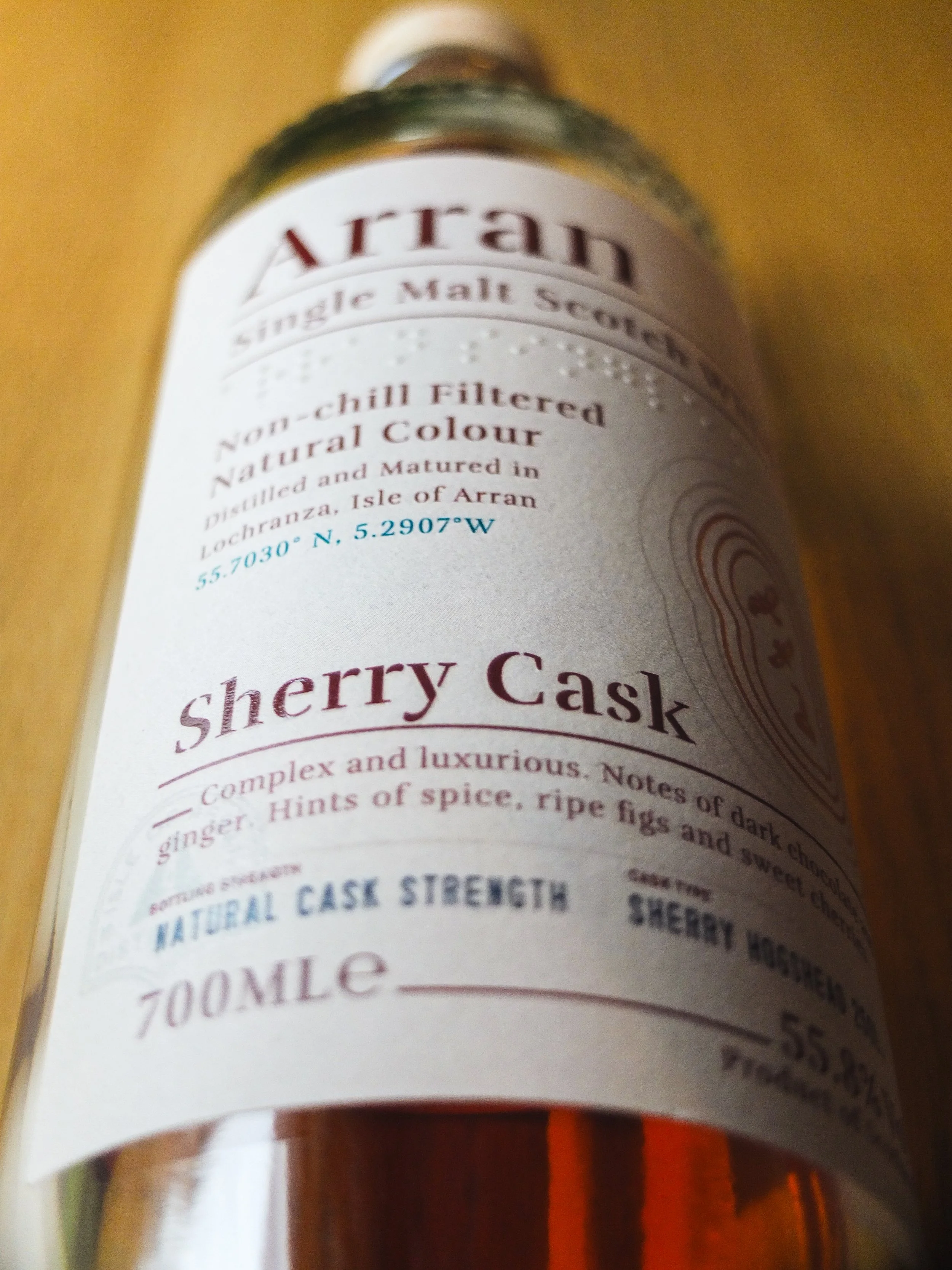 I should thank Earie for his recent review of Arran 10yo, which reminded me not only have I been meaning to review this Sherry Cask expression for some time, but also that we don’t seem to have reviewed it before. It comes in at cask strength at 55.8%, but there’s no specific information on the bottle or the website about what type of ex-sherry casks were used to mature this. I would wager both first and second-fill Oloroso. They do give us the cask size as 250 litre hogsheads. The website is also unclear on the maturation composition, and doesn’t mention either a full maturation or a finish. I should also mention the bottling date stamped on the bottle as 26.10.22, which from memory sounds about when I bought this around Christmas that year.