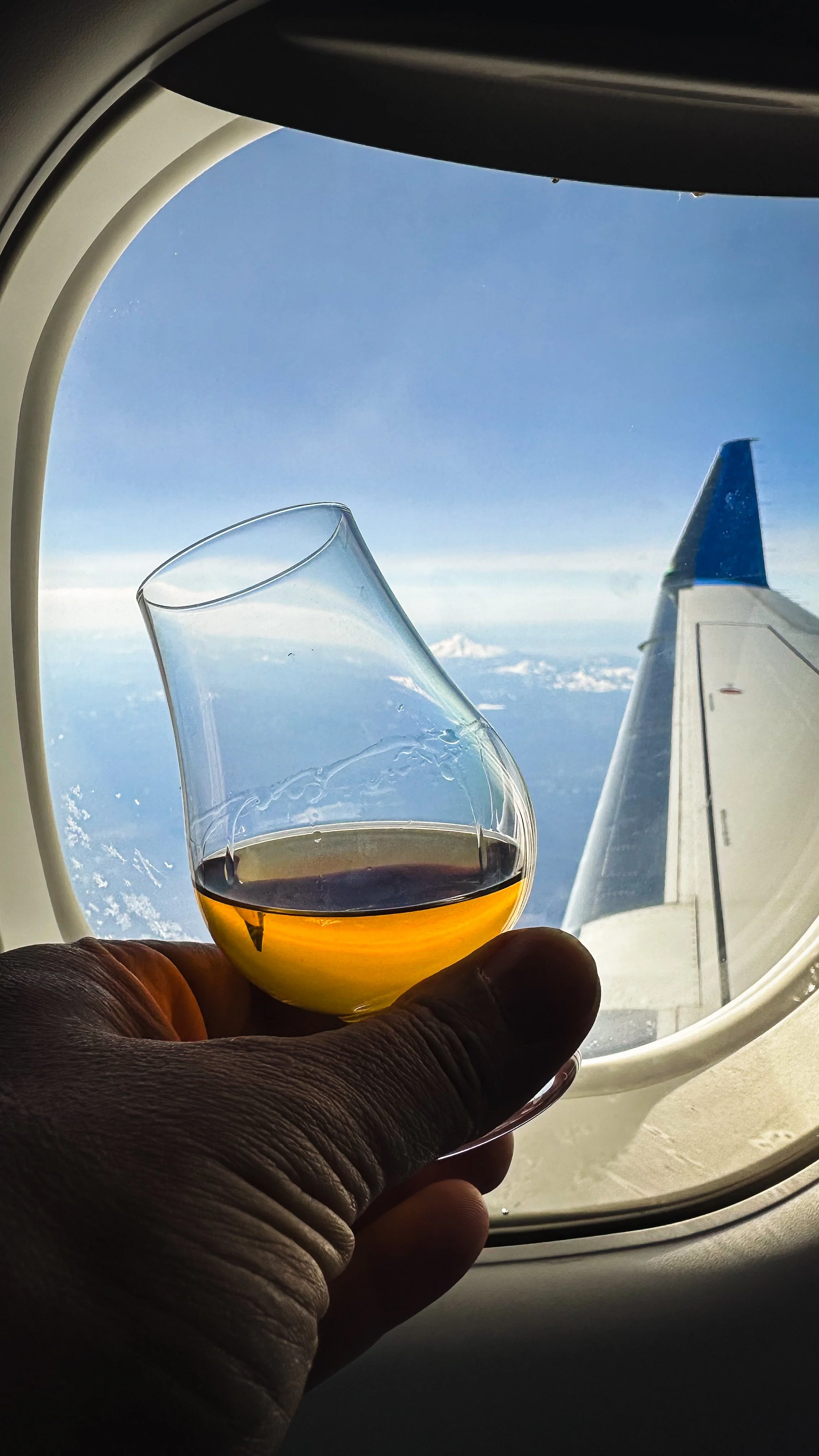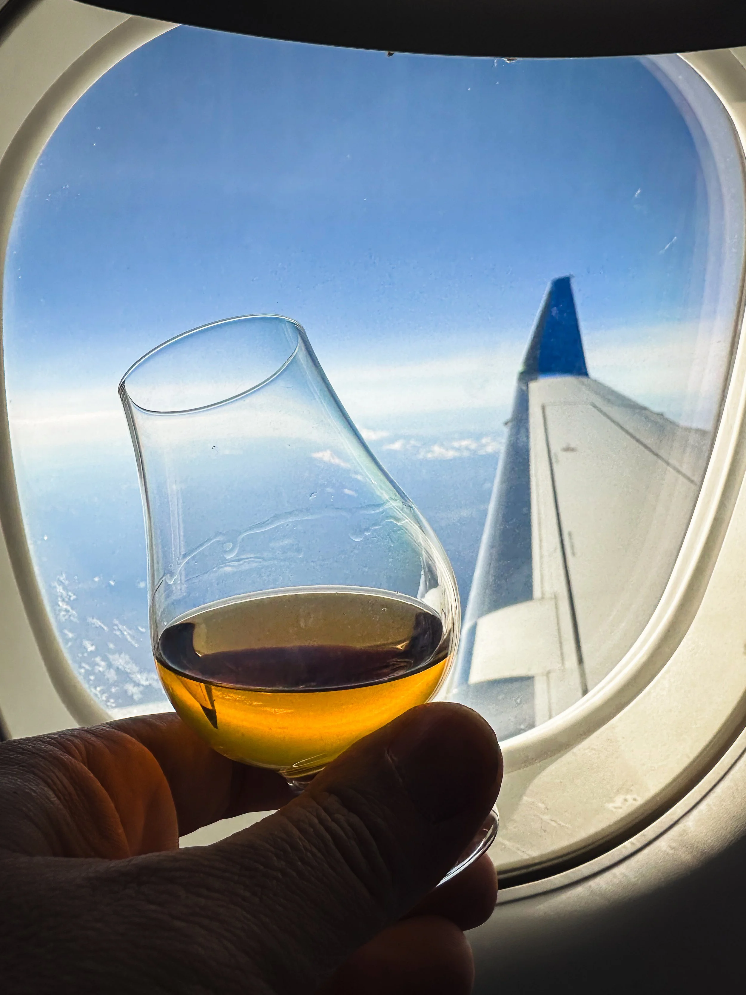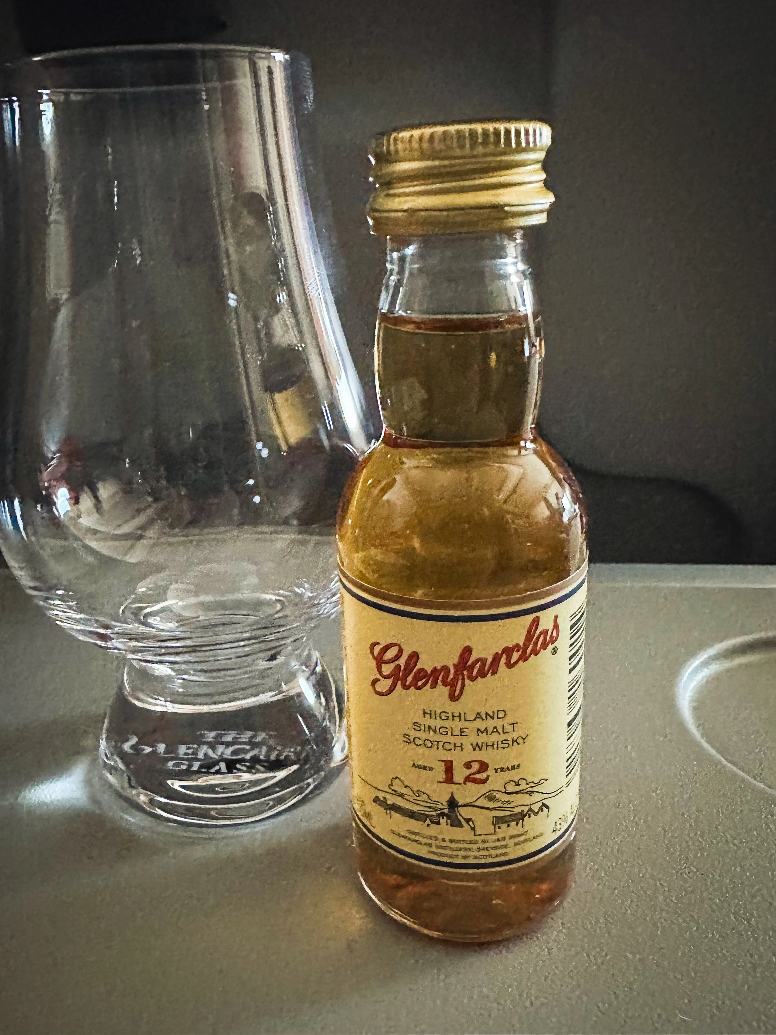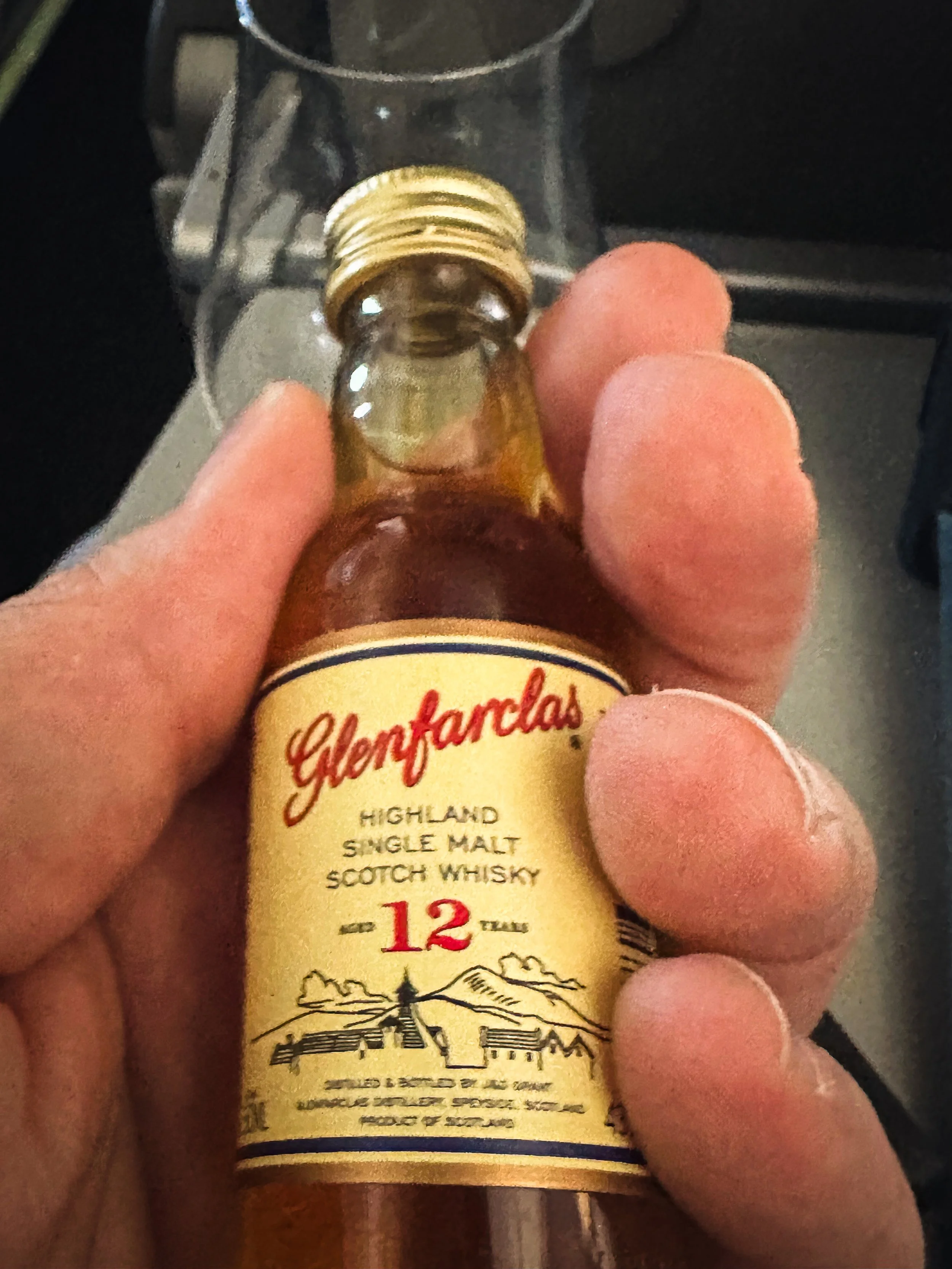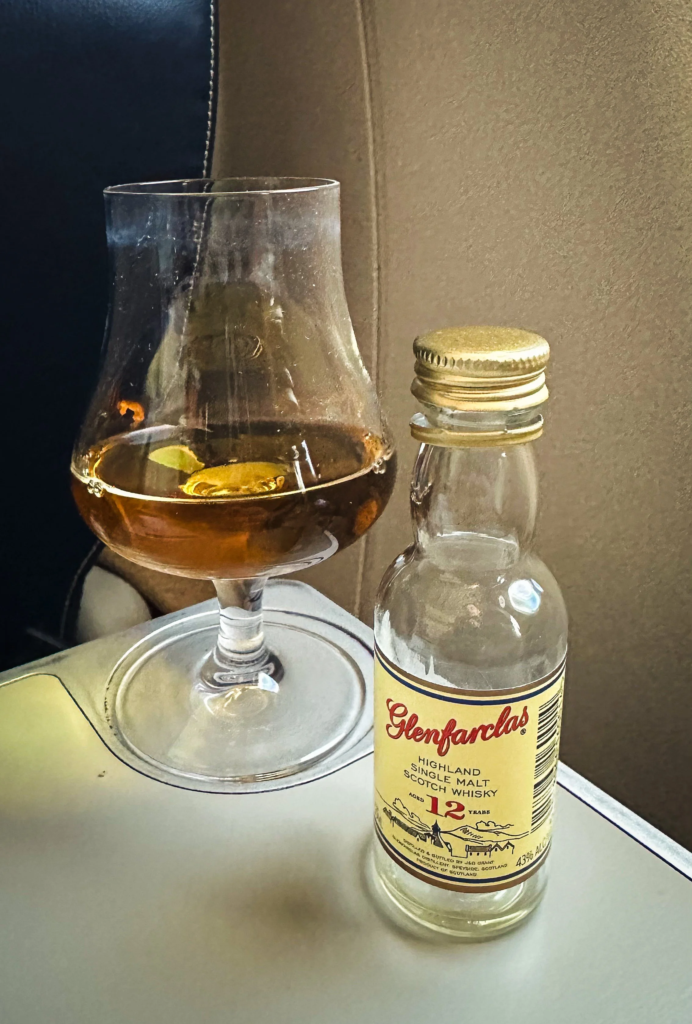 “Glenfarclas please, and could you just bring the little bottle? I brought my own glass.” I point to a glistening Glencairn resting reverently on the tray table.