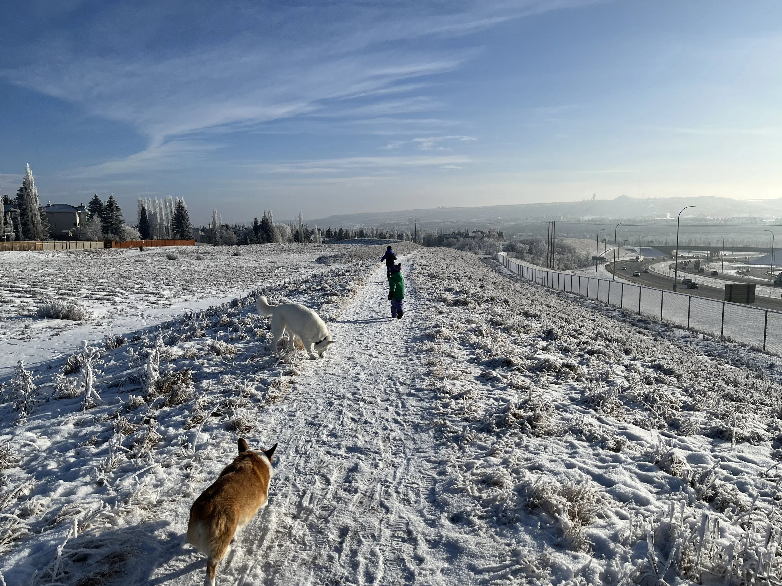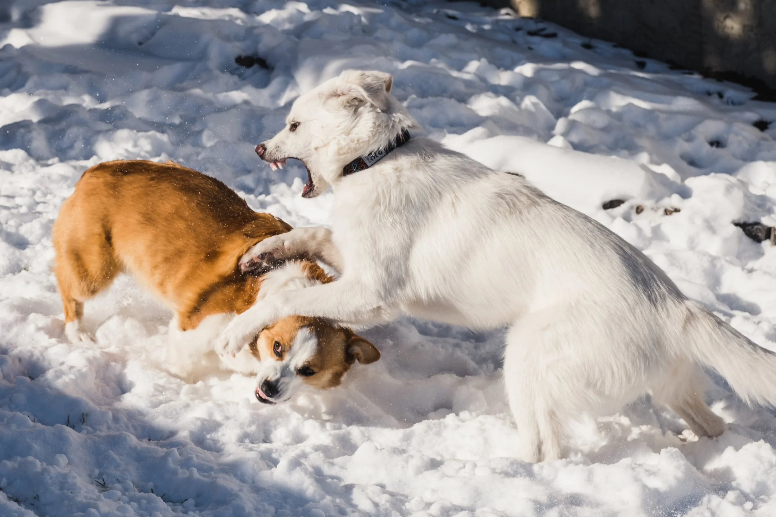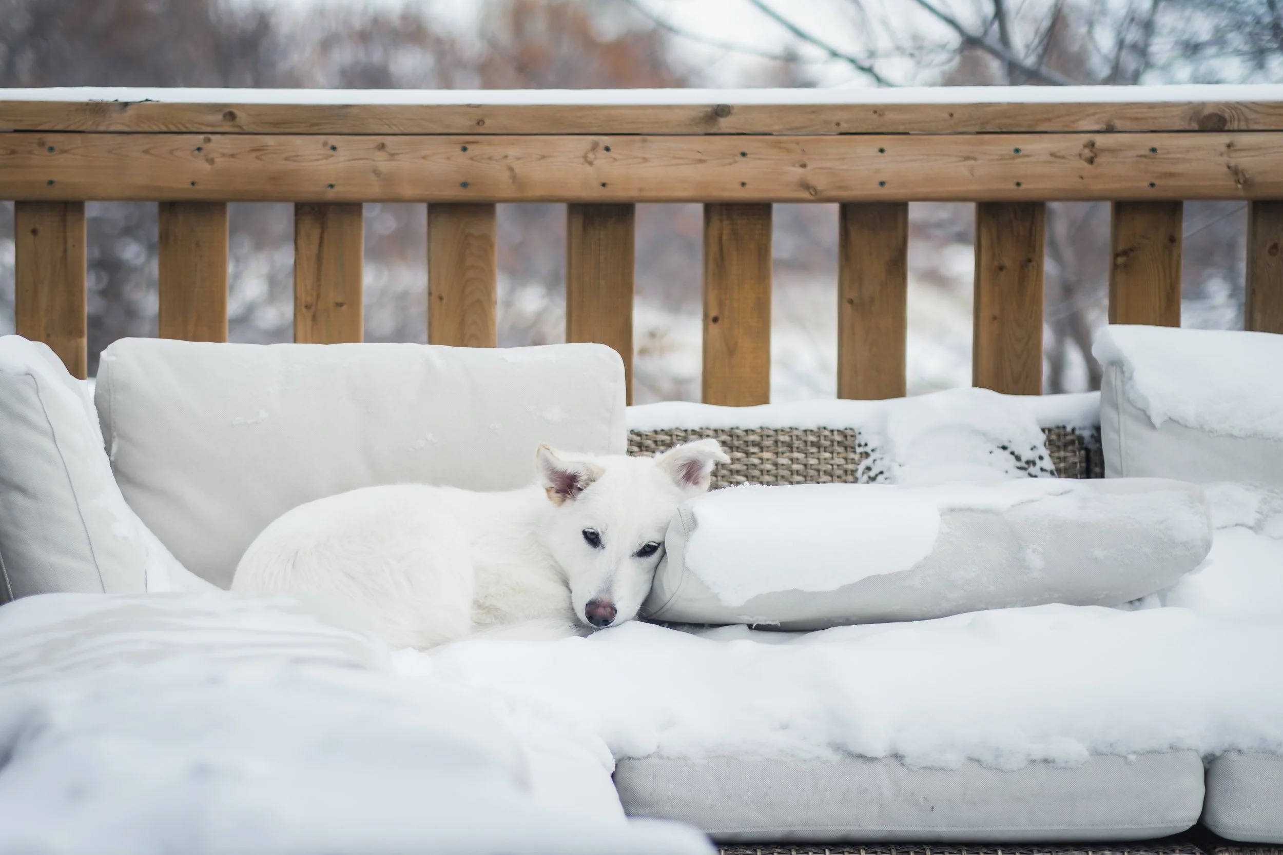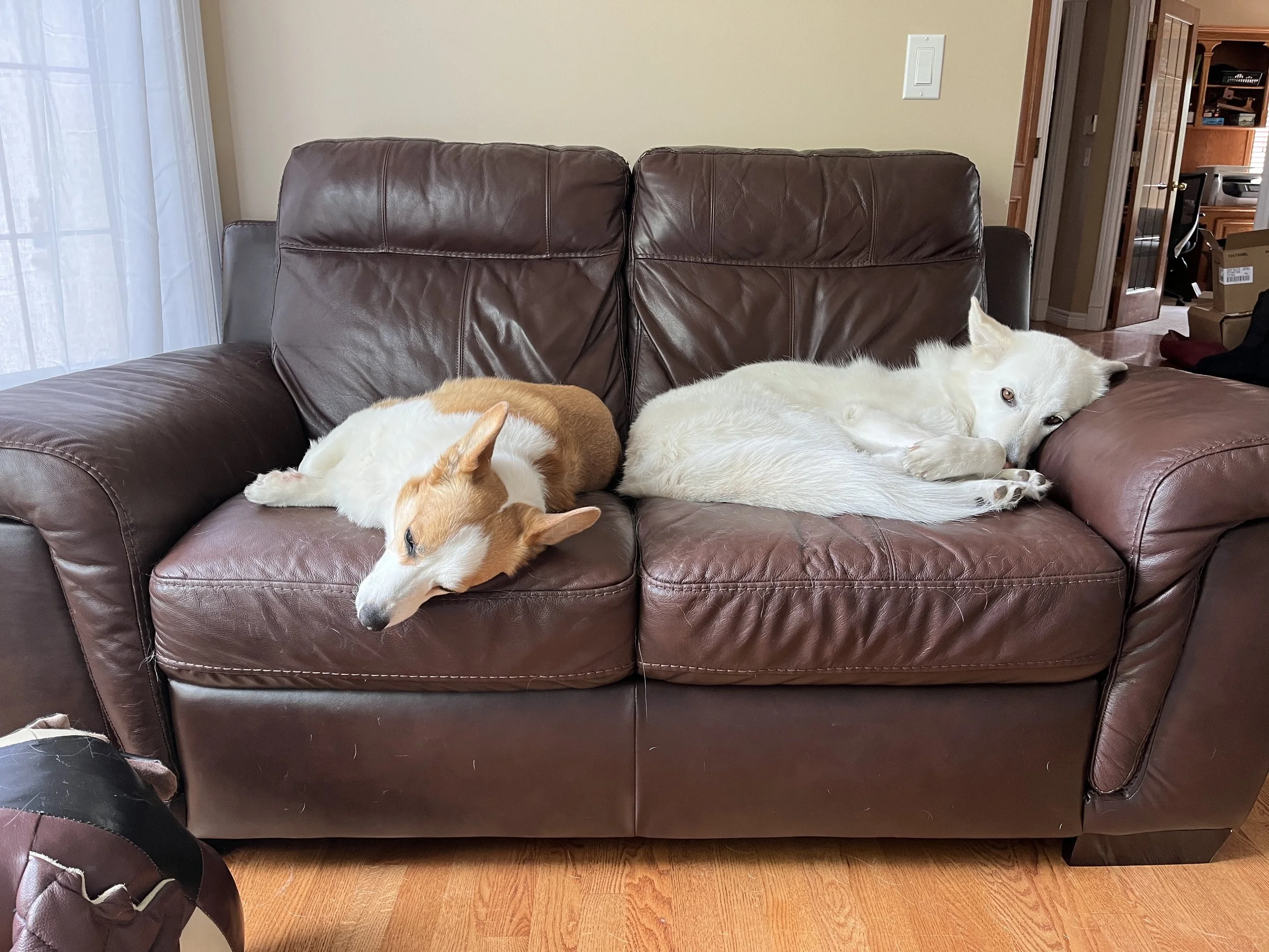 After a meet and greet with her, and agreement that our short-legged stumpy arsehole of a Corgi would not try to rip out her jugular in her sleep and we were of sound mind and situation, she came home with us. We’ve since discovered that she is highly likely a Siberian Husky/Border Collie mix, meaning she sheds hair like a mofo and has some interesting mental tendencies. In the grand scheme of things, this pure ‘white’ furball is a massive pushover. In the summer, she is pure white but against the white of a Canadian winter, there’s some light yellow/cream mixed in there. Anyways…