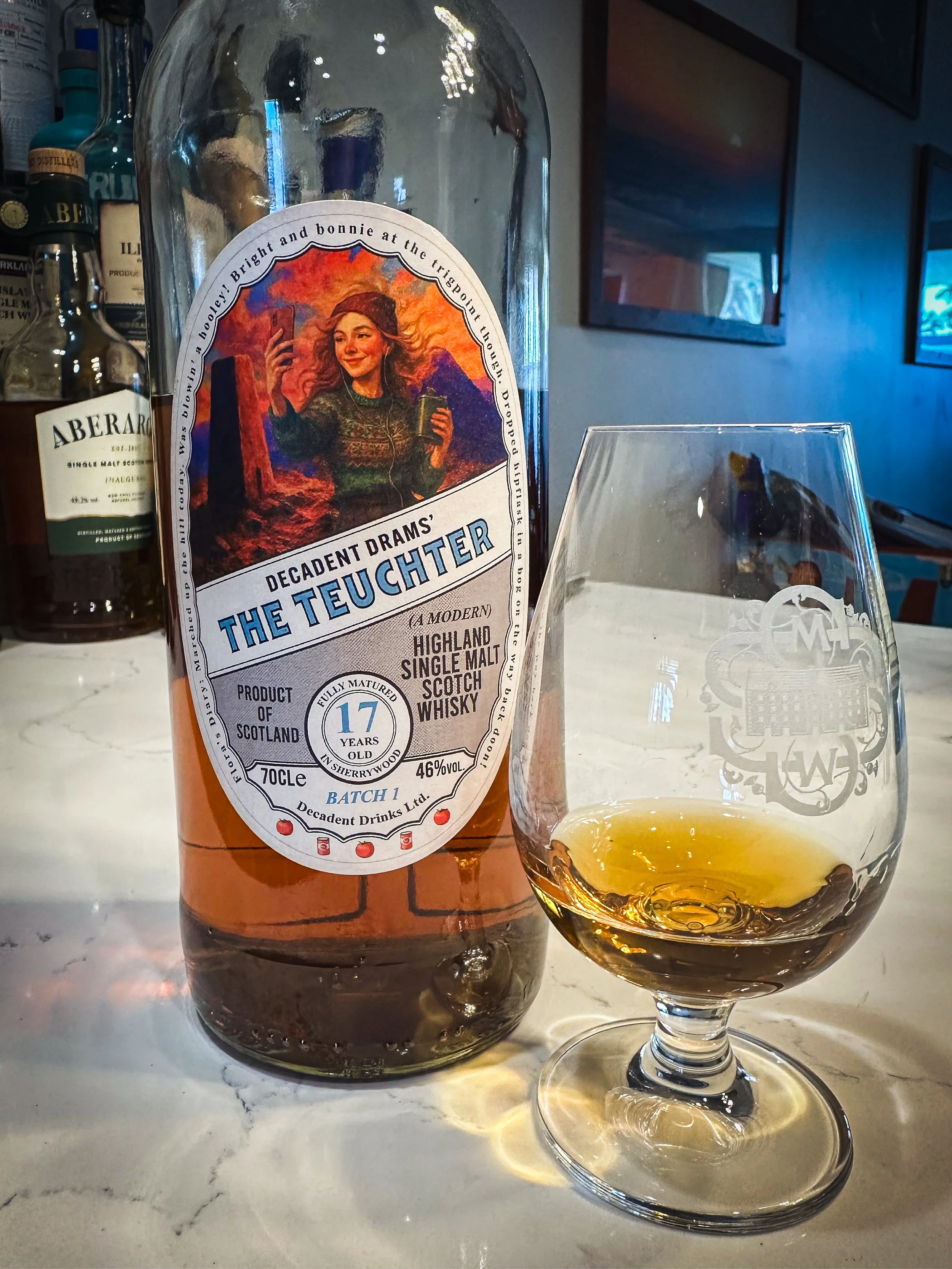 The bottle is a 17 year “Secret Highland” (the internet says Tomatin) and “fully matured in old sherrywood”; a first fill PX cask. “The Teuchter” is a new series from Decadent Drinks that’s meant to be “modern” and “go easy on the wallet.”