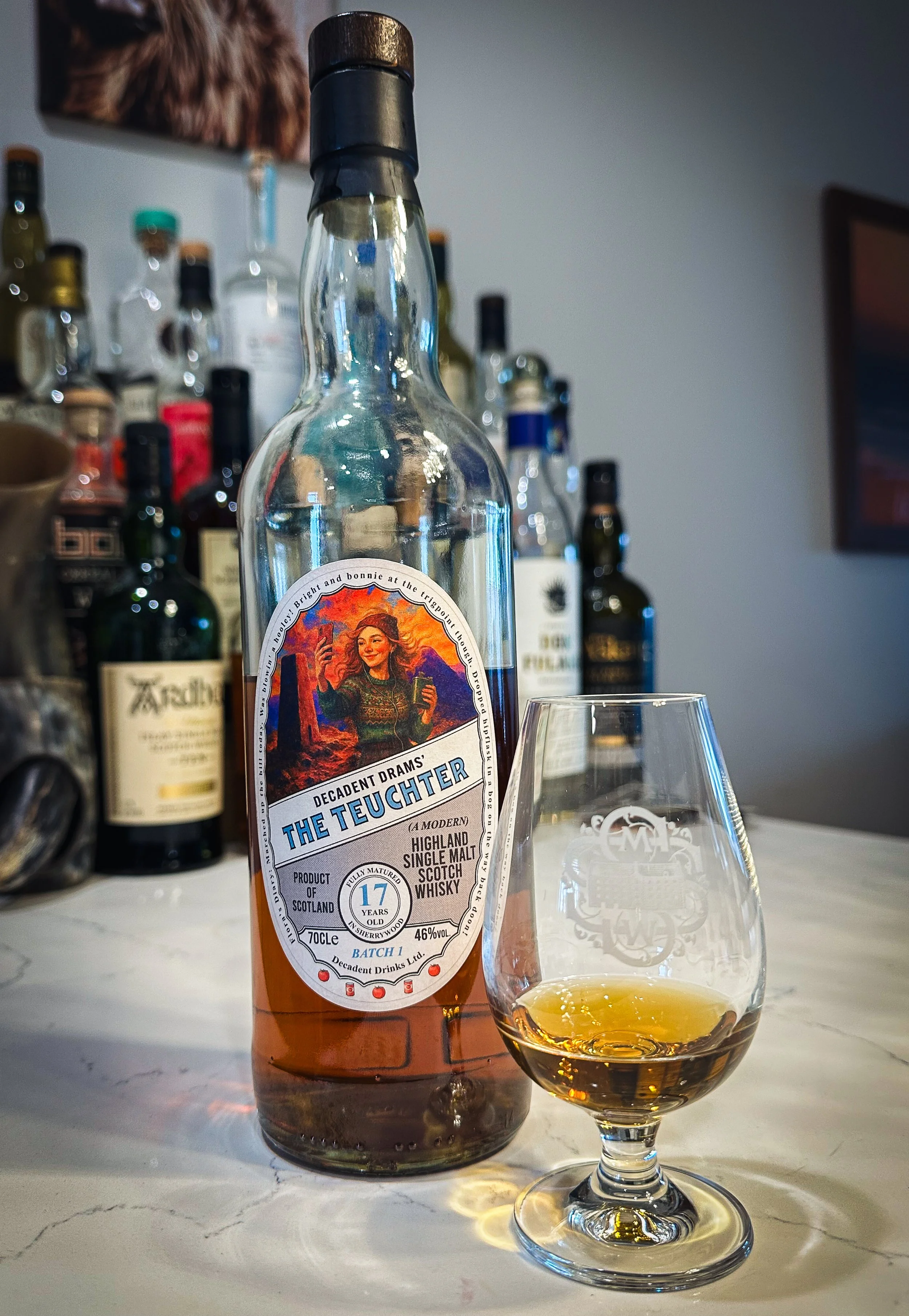 In the case of today’s bottle, it remained untouched for months, always one more photo to take, one more adventure to capture. The wonderful logo and colorful illustration kept creating ideas. I had too many settings for “Flora” the namesake “Teuchter” and high hopes to capture those delightful green, orange, and blue hues elegantly spangled on the label and paired perfectly with the dark, cola color of the sherry matured whisky.