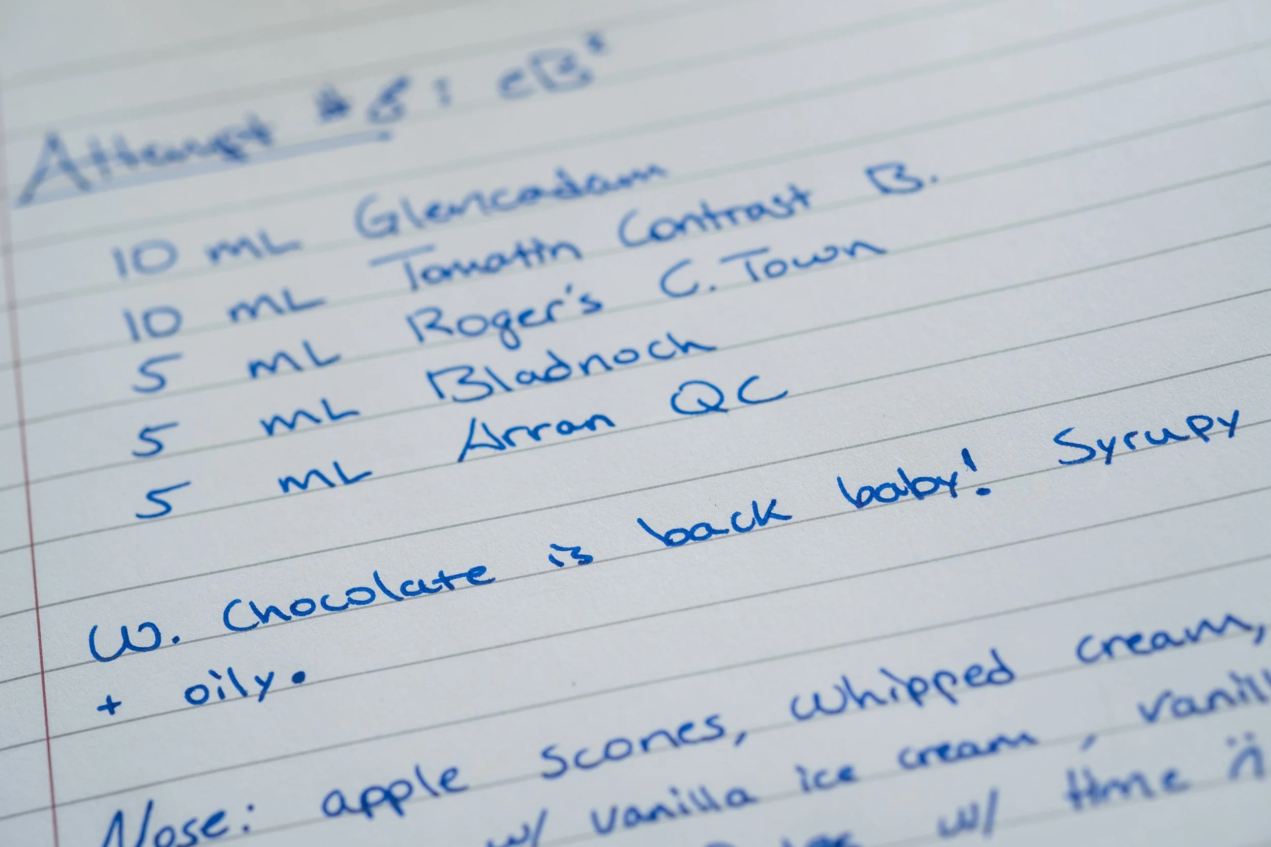Creating an infinity bottle takes many forms. Some simply like to add various whiskies with no specific final flavour destination in mind, but my method is a little more detailed. Next time you’re planning an infinity bottle, you could try this method: Decant your samples into small airtight containers and once you’ve got a small collection of various whiskies, write down the intended flavour and texture profile you’re trying to create or duplicate and begin assembling your components. Get your hands on a liquid measuring cup/spoons, a calculator to determine blend ratios, and a notepad for your thoughts and you can begin to create a more detailed blend.